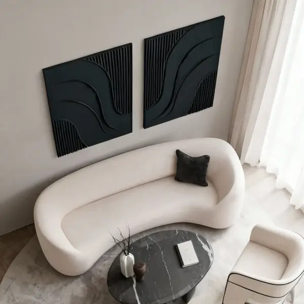 بافت برجسته و عمق سایه‌های سیاه در تابلو دیواری نقره‌تاب ، ترکیبی جاودانه و شیک ایجاد می‌کند که هرگز از مد نمی‌افتد. این طراحی انتزاعی به هر فضایی حس عمق، آرامش و جذابیت بصری می‌بخشد.